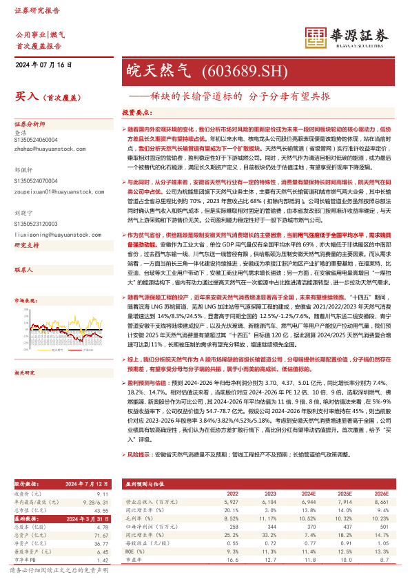 【华源证券】【20240716】皖天然气(603689.SH)-稀缺的长输管道标的 分子分母有望共振-25页