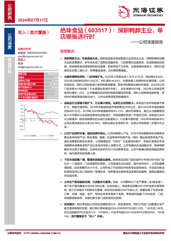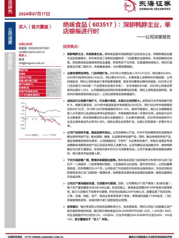 【东海证券】【20240717】绝味食品(603517):深耕鸭脖主业,单店提振进行时——公司深度报告-33页