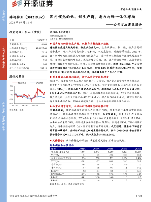 【开源证券】【20240718】腾远钴业-公司首次覆盖报告:国内领先的钴、铜生产商,着力打造一体化布局-20页