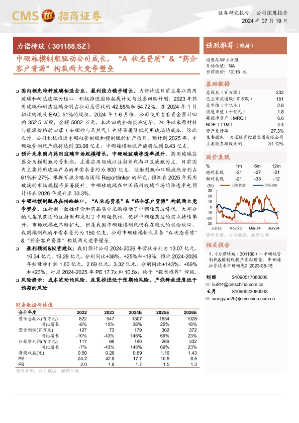 【海通证券】【20240719】中硼硅模制瓶驱动公司成长,“A状态资质”&“药企客户资源”构筑两大竞争壁垒-18页