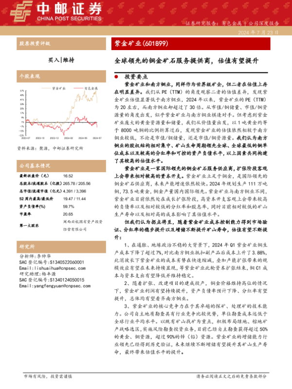 【中邮证券】【20240723】20240723-中邮证券-紫金矿业-601899.SH-全球领先的铜金矿石服务提供商,估值有望提升-29页