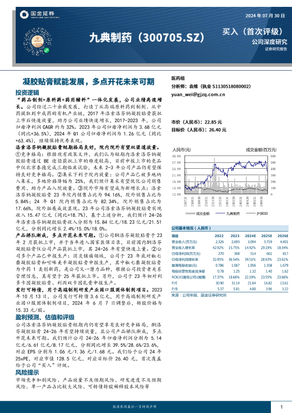 【国金证券】【20240730】九典制药-300705.SZ-凝胶贴膏赋能发展,多点开花未来可期-20页