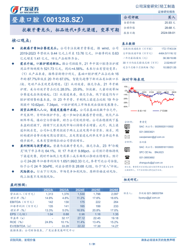 【广发证券】【20240801】20240801-广发证券-登康口腔-001328.SZ-抗敏牙膏龙头,拓品迭代+多元渠道,变革可期-31页