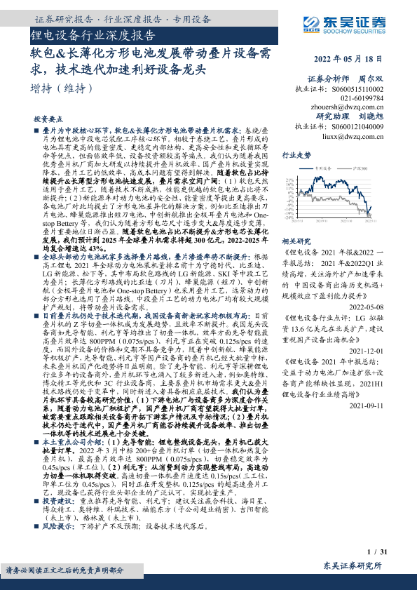 【东吴证券】【20220518】锂电设备行业深度报告:软包&长薄化方形电池发展带动叠片设备需求,技术迭代加速利好设备龙头-31页