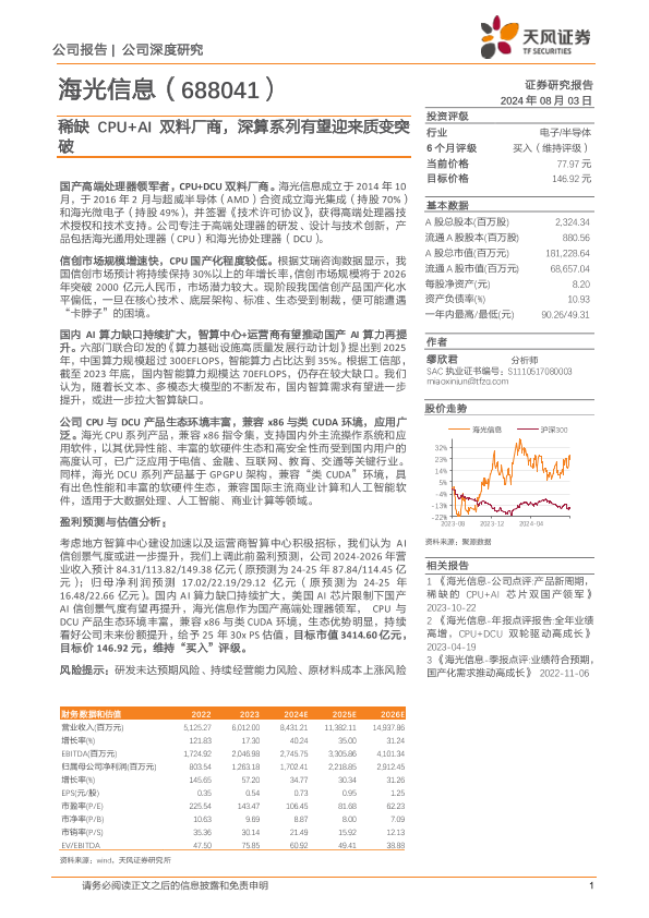 【天风证券】【20240803】海光信息-稀缺CPU+AI双料厂商,深算系列有望迎来质变突破-26页