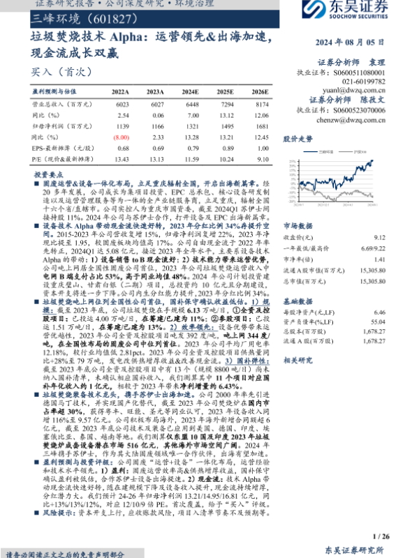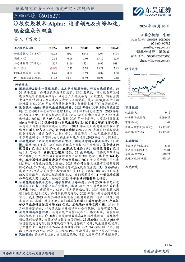 【东吴证券】【20240805】三峰环境-601827.SH-垃圾焚烧技术Alpha:运营领先&出海加速,现金流成长双赢-26页