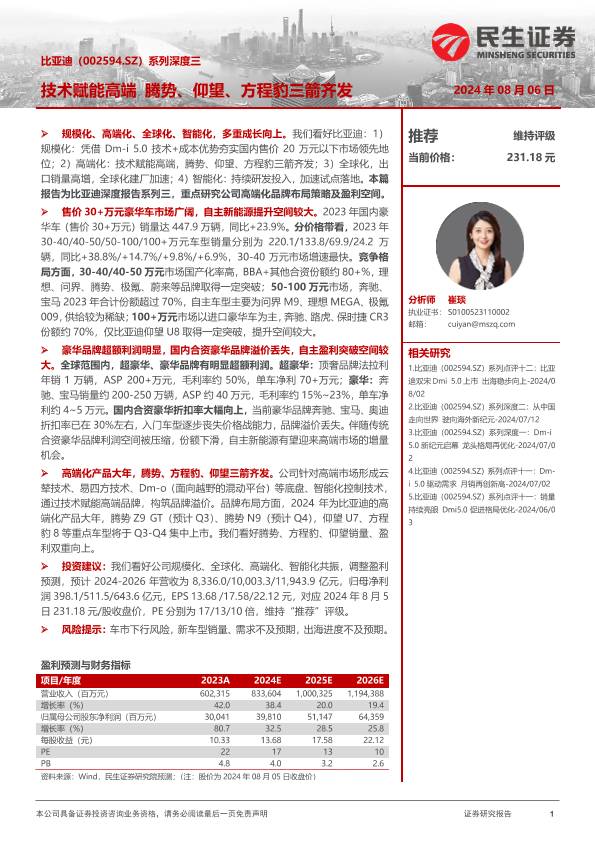 【民生证券】【20240806】比亚迪-002594.SZ-系列深度三:技术赋能高端 腾势、仰望、方程豹三箭齐发-50页