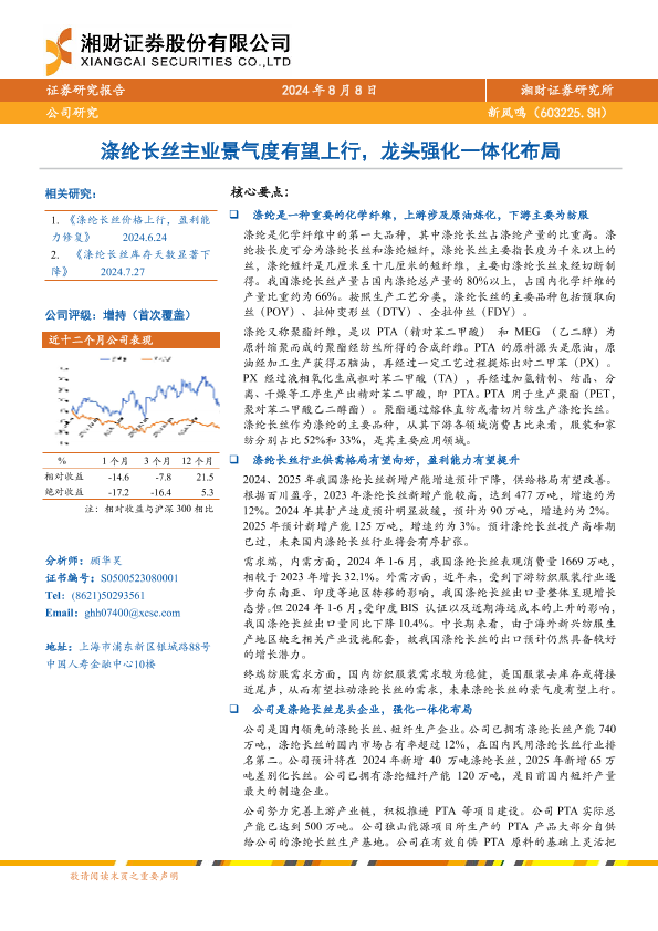 【湘财证券】【20240808】涤纶长丝主业景气度有望上行,龙头强化一体化布局-27页