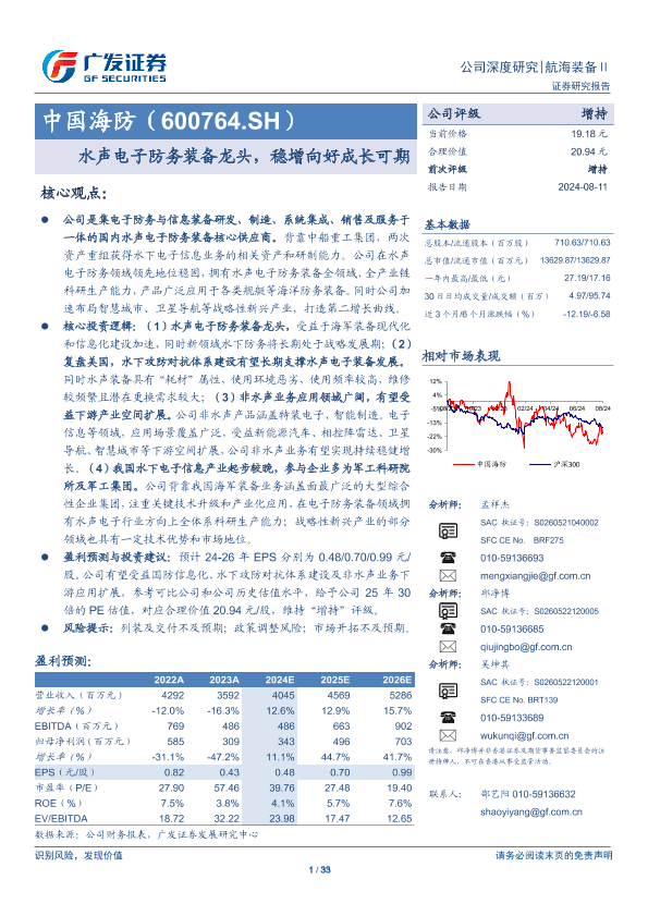 【广发证券】【20240811】中国海防(600764.SH):水声电子防务装备龙头,稳增向好成长可期-33页