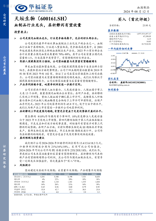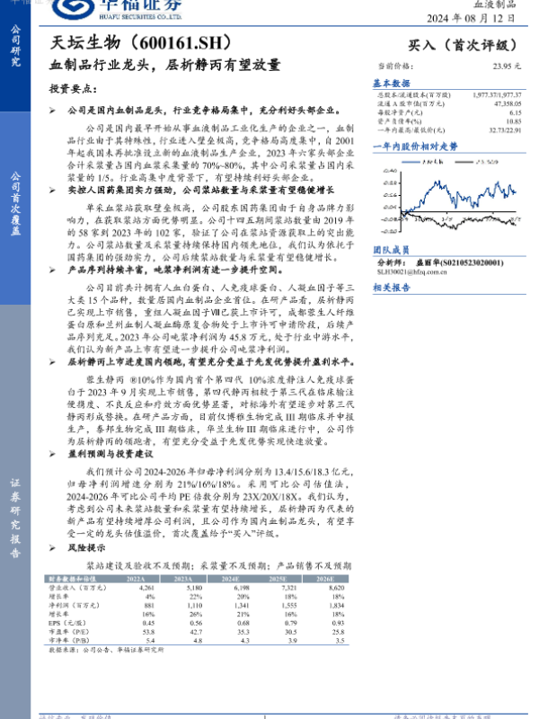 【华福证券】【20240812】天坛生物-600161.SH-血制品行业龙头,层析静丙有望放量-21页