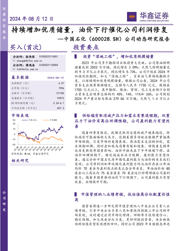 中国石化 储量增加 利润修复 市值管理 油价下行