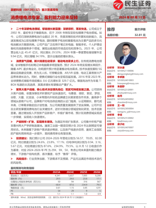 【民生证券】【20240813】豪鹏科技-001283.SZ-首次覆盖报告:消费锂电池专家,盈利能力迎来反转-27页