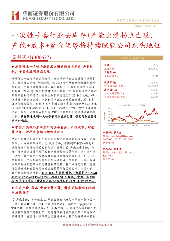 【华西证券】【20240814】一次性手套行业去库存+产能出清拐点已现,产能+成本+资金优势将持续赋能公司龙头地位-21页
