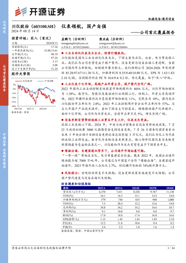【开源证券】【20240814】川仪股份-公司首次覆盖报告:仪表领航,国产自强-34页