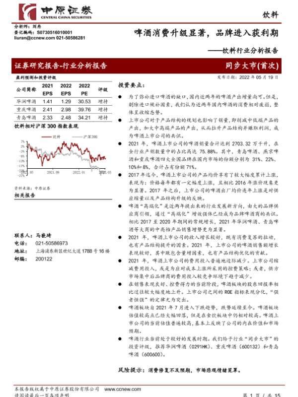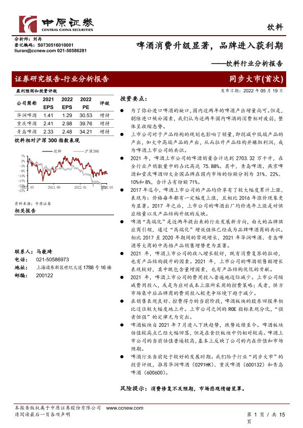 【中原证券】【20220519】饮料行业分析报告:啤酒消费升级显著,品牌进入获利期-15页