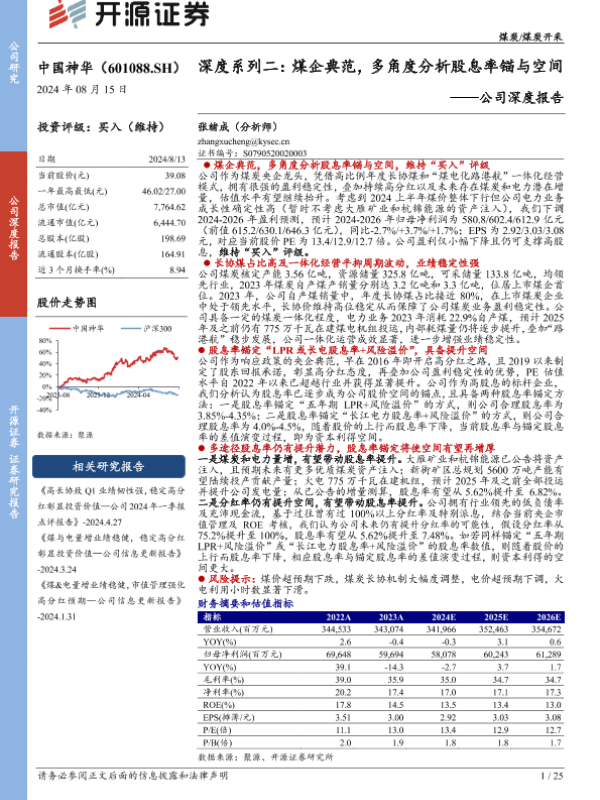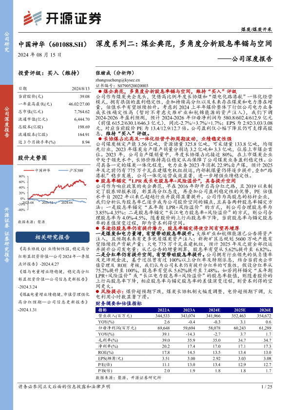 【开源证券】【20240815】中国神华-公司深度报告:深度系列二:煤企典范,多角度分析股息率锚与空间-25页