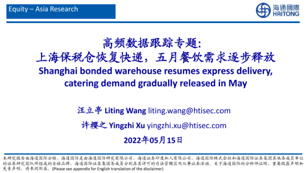 【海通国际】【20220515】高频数据跟踪专题:上海保税仓恢复快递,五月餐饮需求逐步释放-30页