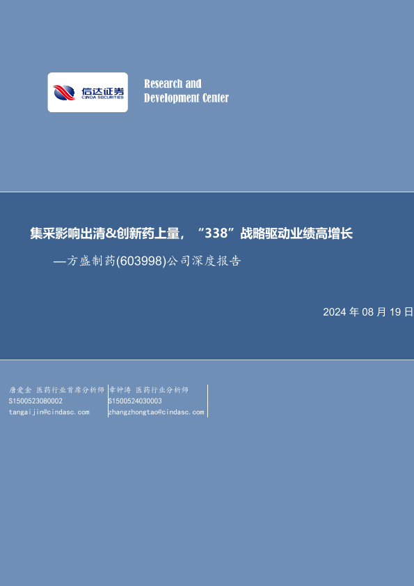 【信达证券】【20240819】20240819-信达证券-方盛制药-603998.SH-公司深度报告:集采影响出清&创新药上量,“338”战略驱动业绩高增长-34页