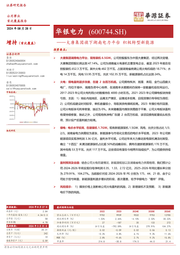 【华源证券】【20240828】华源证券-华银电力-600744.SH-大唐集团旗下湖南电力平台积极转型新能源-14页