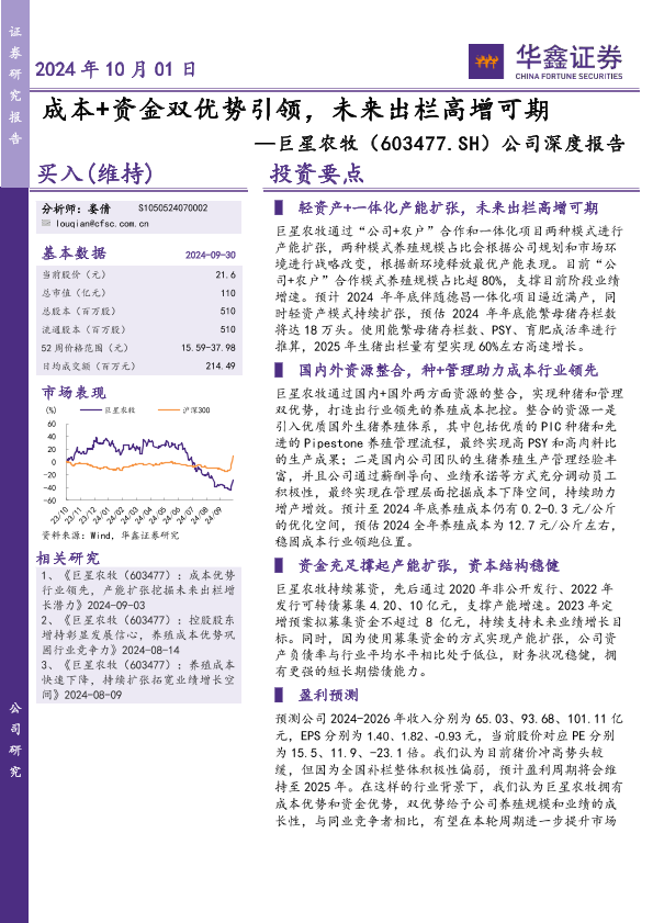 【华鑫证券】【20241001】巨星农牧-603477.SH-公司深度报告:成本+资金双优势引领,未来出栏高增可期-22页