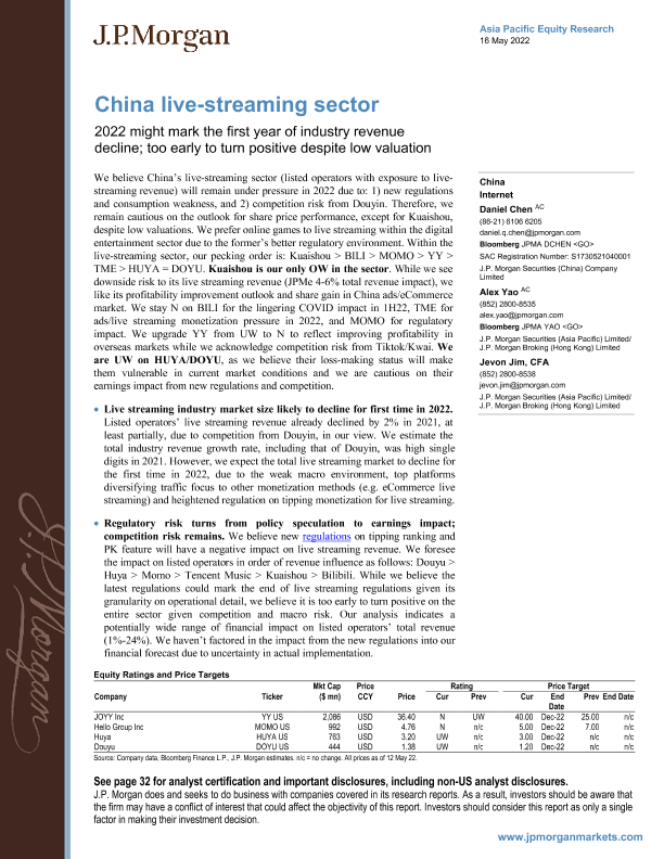 【J.P. Morgan】【20220516】中国流媒体行业-2022年可能是行业收入下降的第一年;尽管估值较低,但要扭亏为盈还为时过早-36页