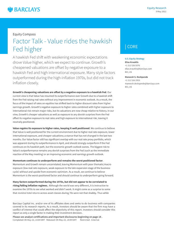 【Barclays】【20220509】Equity Compass Factor Talk- Value rides the hawkish Fed higher-22页