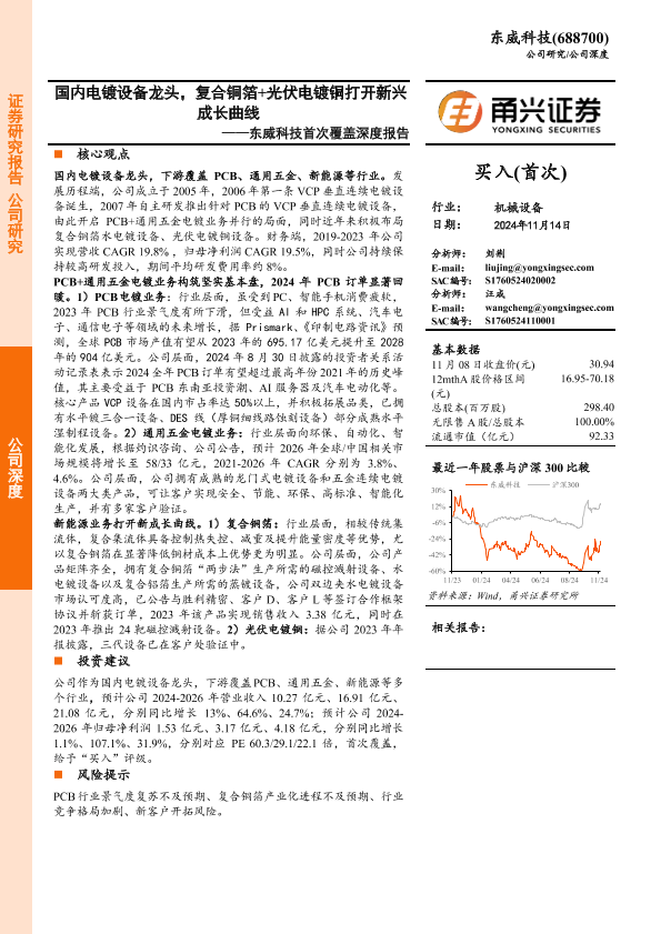 【甬兴证券】【20241114】东威科技首次覆盖深度报告:国内电镀设备龙头,复合铜箔+光伏电镀铜打开新兴成长曲线-22页