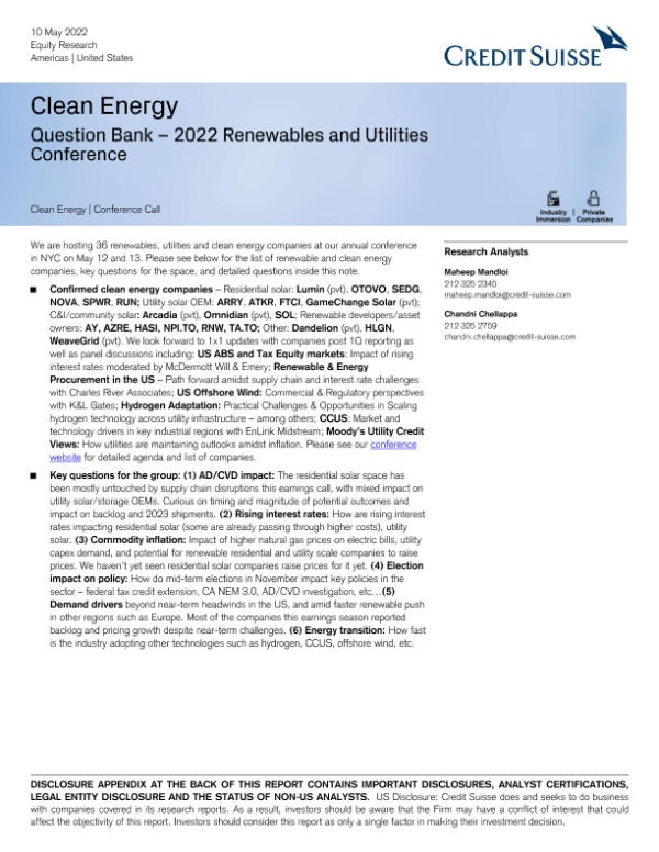 【Credit Suisse】【20220510】瑞信-美股清洁能源行业-问题库:2022年可再生能源和公用事业会议-30页