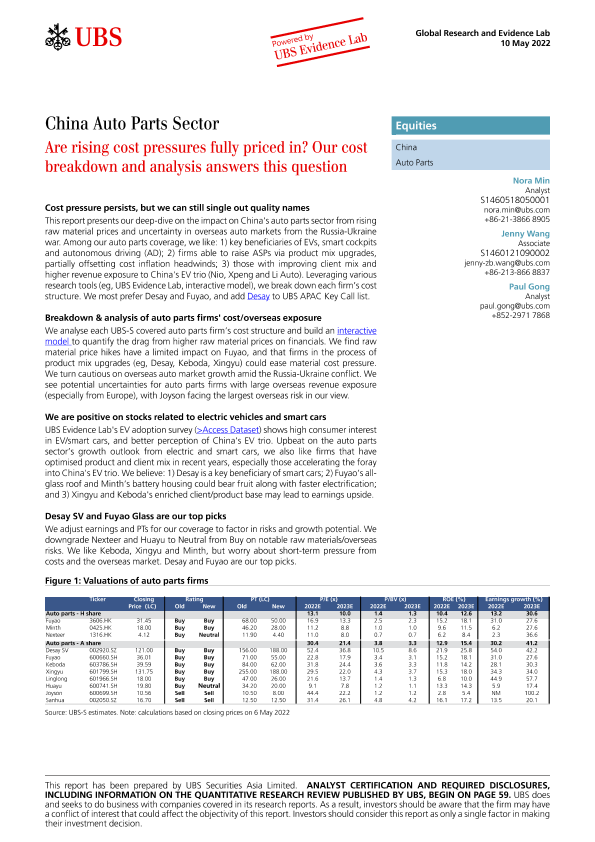 【瑞银】【20220510】中国汽车零部件行业-不断上升的成本压力是否已完全考虑在内?我们的成本分解和分析回答了这个问题-66页
