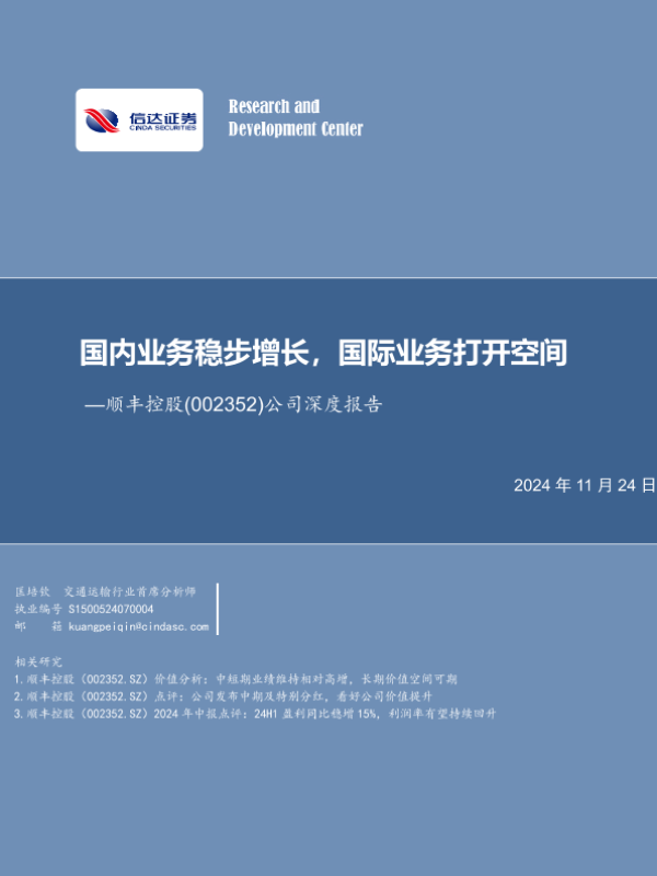 【信达证券】【20241124】20241124-信达证券-顺丰控股-002352.SZ-公司深度报告:国内业务稳步增长,国际业务打开空间-26页