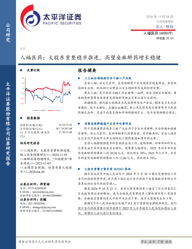 【太平洋证券】【20241128】人福医药:大股东重整稳步推进,高壁垒麻醉药增长稳健-19页