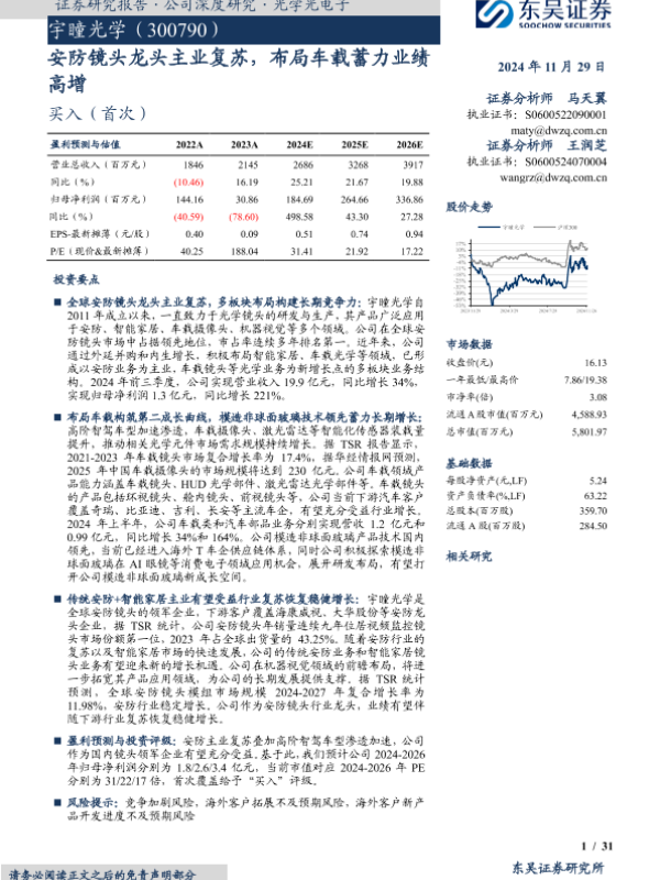 【东吴证券】【20241129】安防镜头龙头主业复苏,布局车载蓄力业绩高增-31页