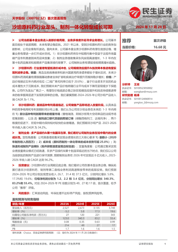 【民生证券】【20241128】天宇股份首次覆盖报告:沙坦原料药行业龙头,制剂一体化转型成长可期-27页