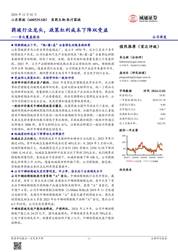 【诚通证券】【20241202】山东药玻-600529.SH-首次覆盖报告:药玻行业龙头,政策红利成本下降双受益-27页