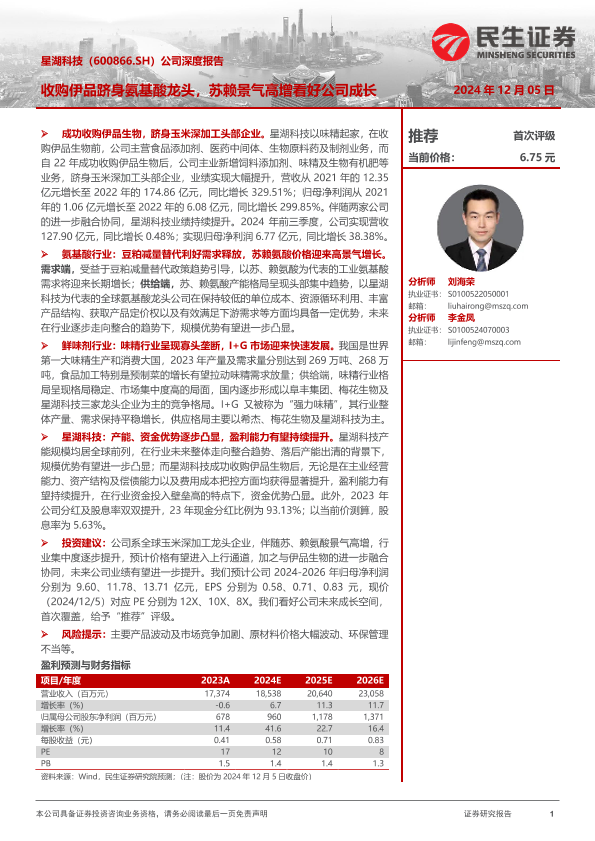 【民生证券】【20241205】星湖科技-600866.SH-公司深度报告:收购伊品跻身氨基酸龙头,苏赖景气高增看好公司成长-48页