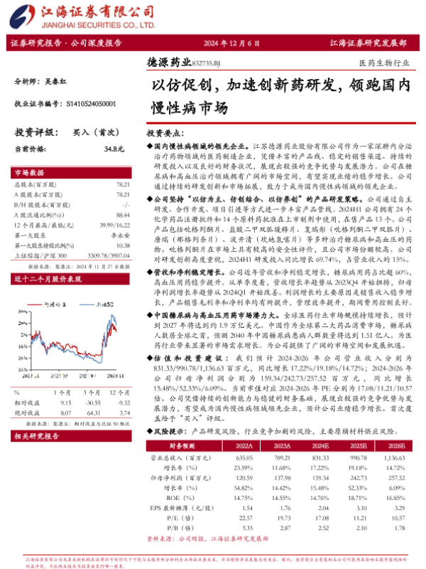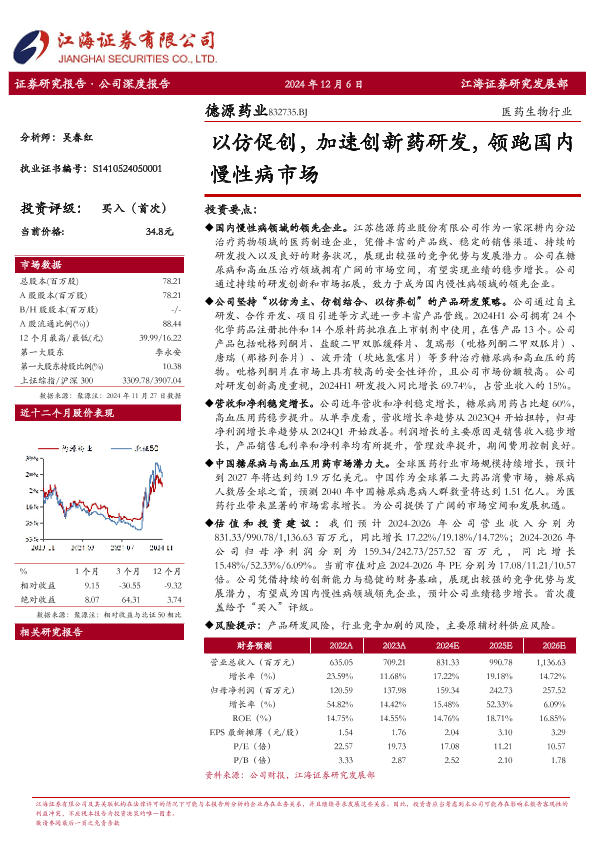 【江海证券】【20241206】以仿促创,加速创新药研发,领跑国内慢性病市场-38页