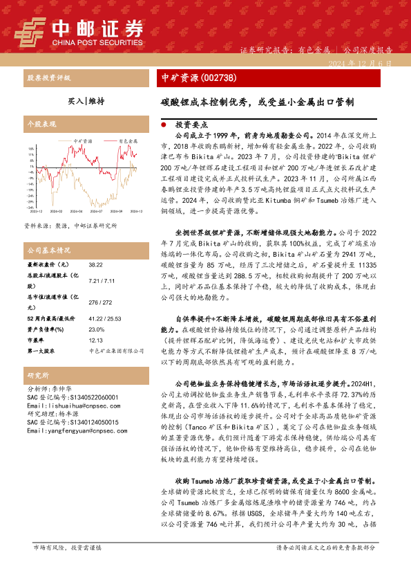【中邮证券】【20241206】中矿资源-碳酸锂成本控制优秀,或受益小金属出口管制-20页
