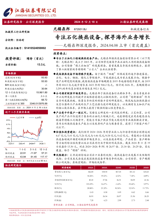 【江海证券】【20241218】无锡鼎邦深度报告,2024.04.08上市(首次覆盖):专注石化换热设备,探寻海外业务增长-38页
