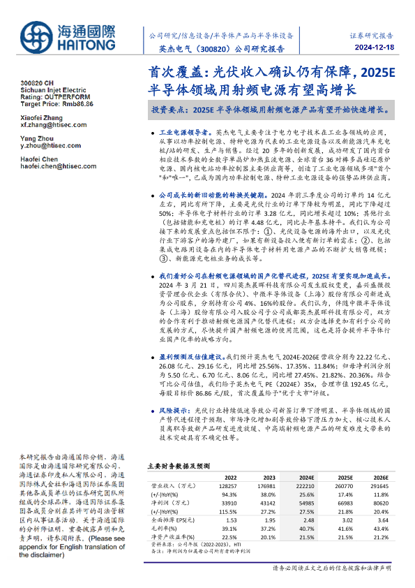 【海通国际】【20241218】英杰电气首次覆盖:光伏收入确认仍有保障,2025E半导体领域用射频电源有望高增长-21页