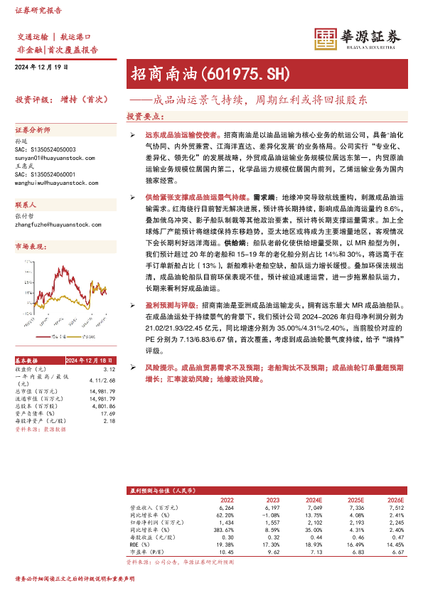 【华源证券】【20241219】招商南油-601975.SH-成品油运景气持续,周期红利或将回报股东-21页
