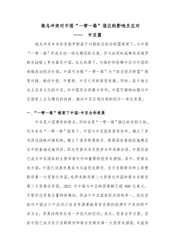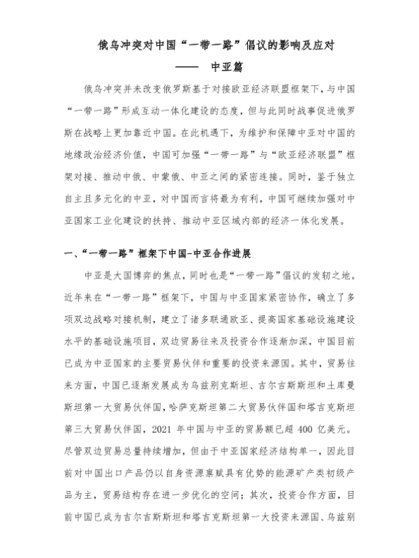 【中诚信国际】【20230101】俄乌冲突对“一带一路”倡议的影响及应对-中亚篇-6页