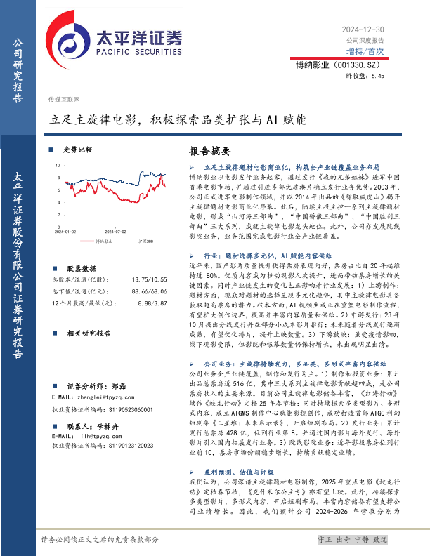 【太平洋证券】【20241230】立足主旋律电影,积极探索品类扩张与AI赋能-30页