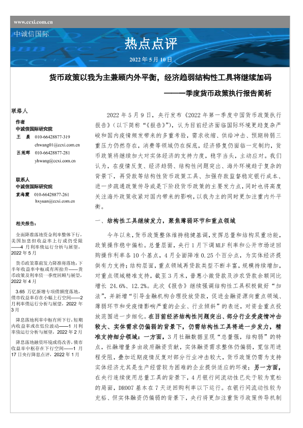 【中诚信国际】【20220509】货币政策以我为主兼顾内外平衡,经济趋弱结构性工具将继续加码-6页