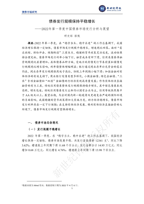 【新世纪评级】【20220406】2022年第一季度中国债券市场发行分析与展望:债券发行规模保持平稳增长-18页