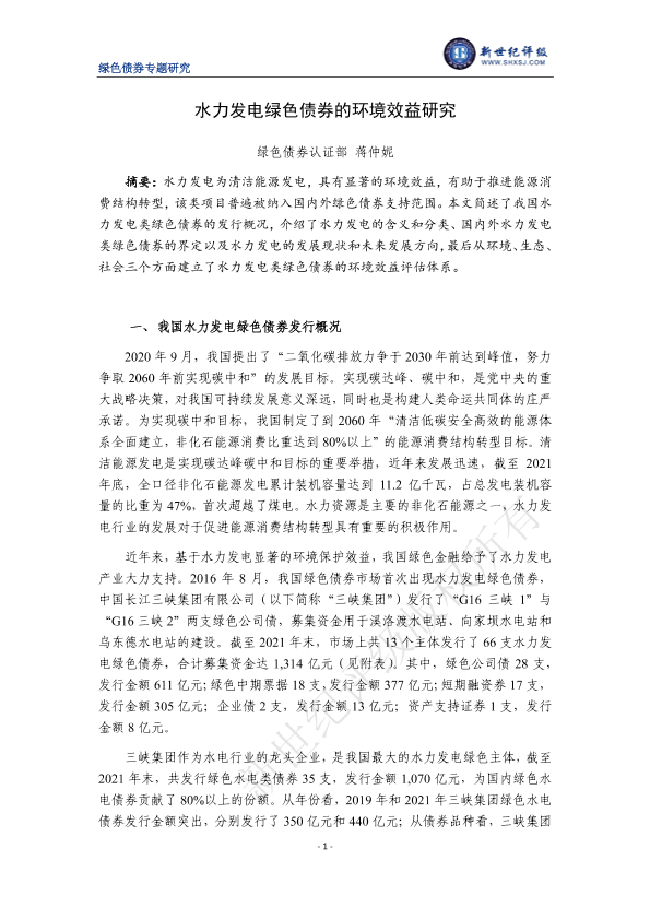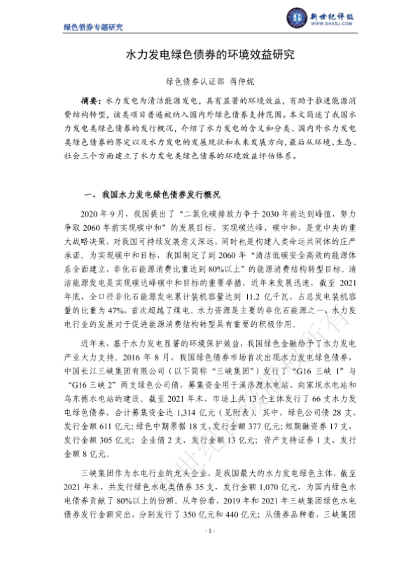 【新世纪评级】【20220101】水力发电类绿色债券的环境效益研究-14页