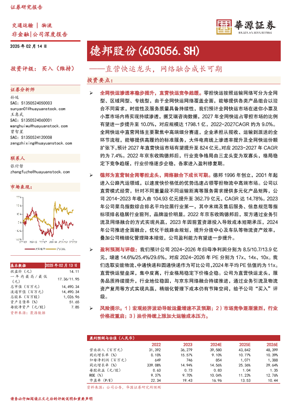 【华源证券】【20250214】德邦股份——直营快运龙头,网络融合成长可期-25页