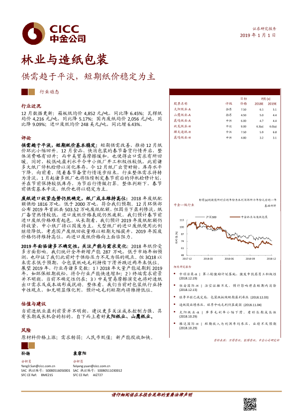【中金公司】【20190101】20190101-中金公司-林业与造纸包装行业动态:供需趋于平淡,短期纸价稳定为主-8页