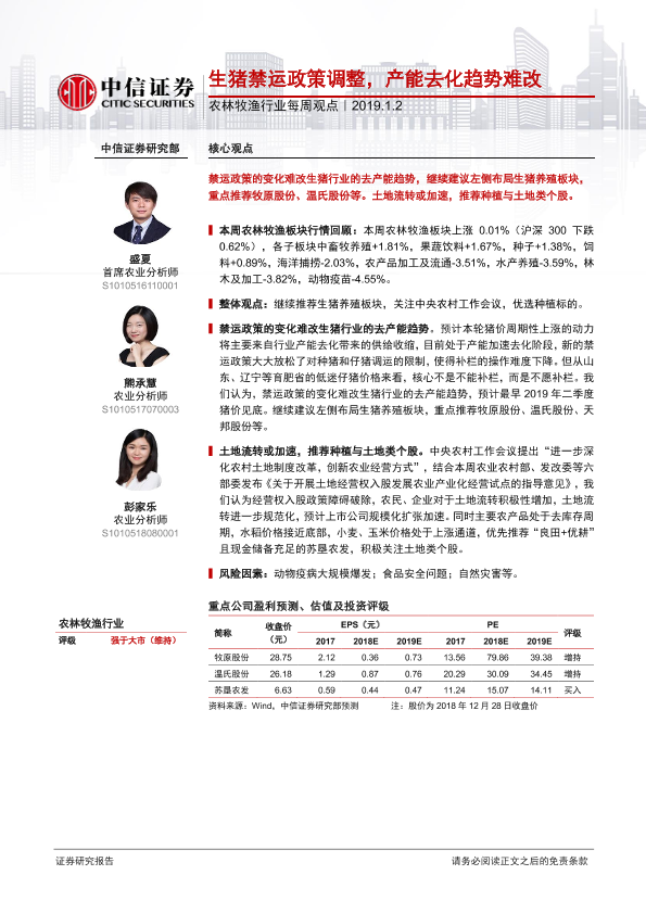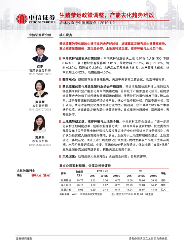 【中信证券】【20190102】农林牧渔行业每周观点:生猪禁运政策调整,产能去化趋势难改-6页
