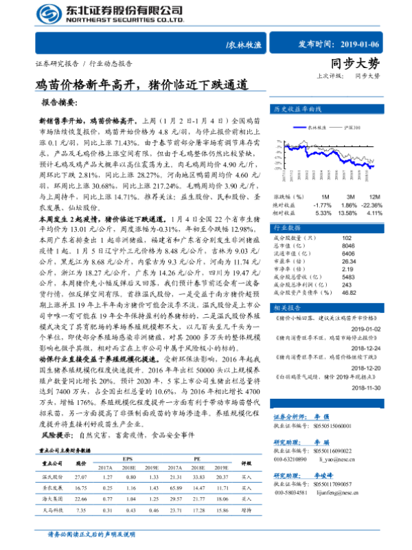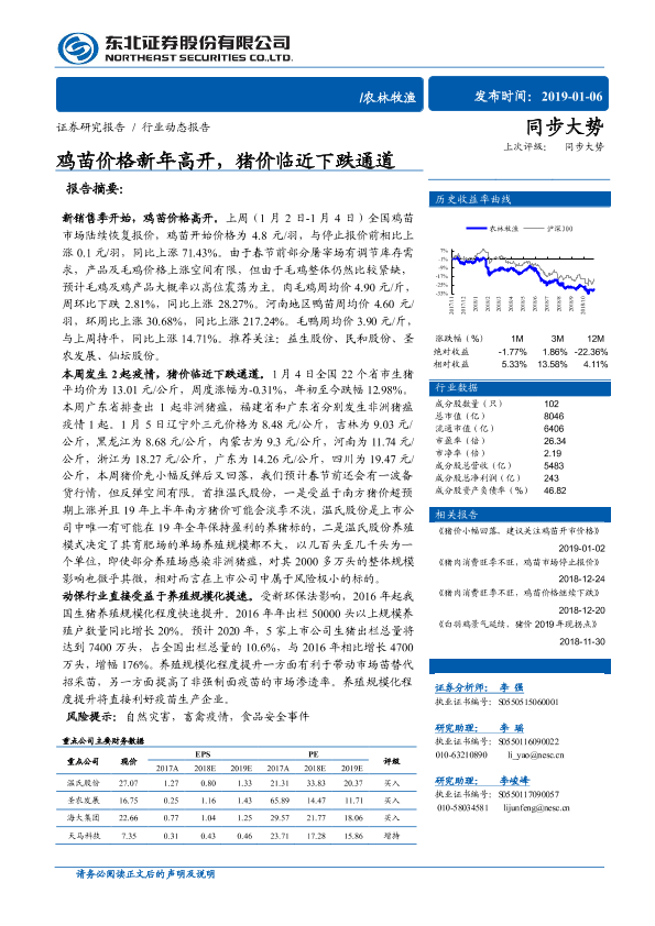 【东北证券】【20190106】20190106-东北证券-农林牧渔行业动态报告:鸡苗价格新年高开,猪价临近下跌通道-13页