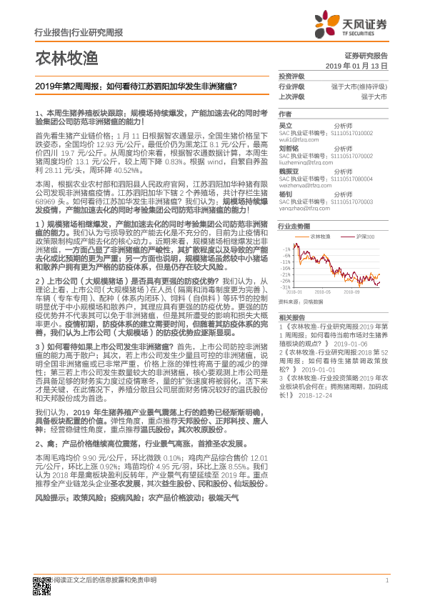 【天风证券】【20190113】2019年第2周周报:如何看待江苏泗阳加华发生非洲猪瘟?-14页